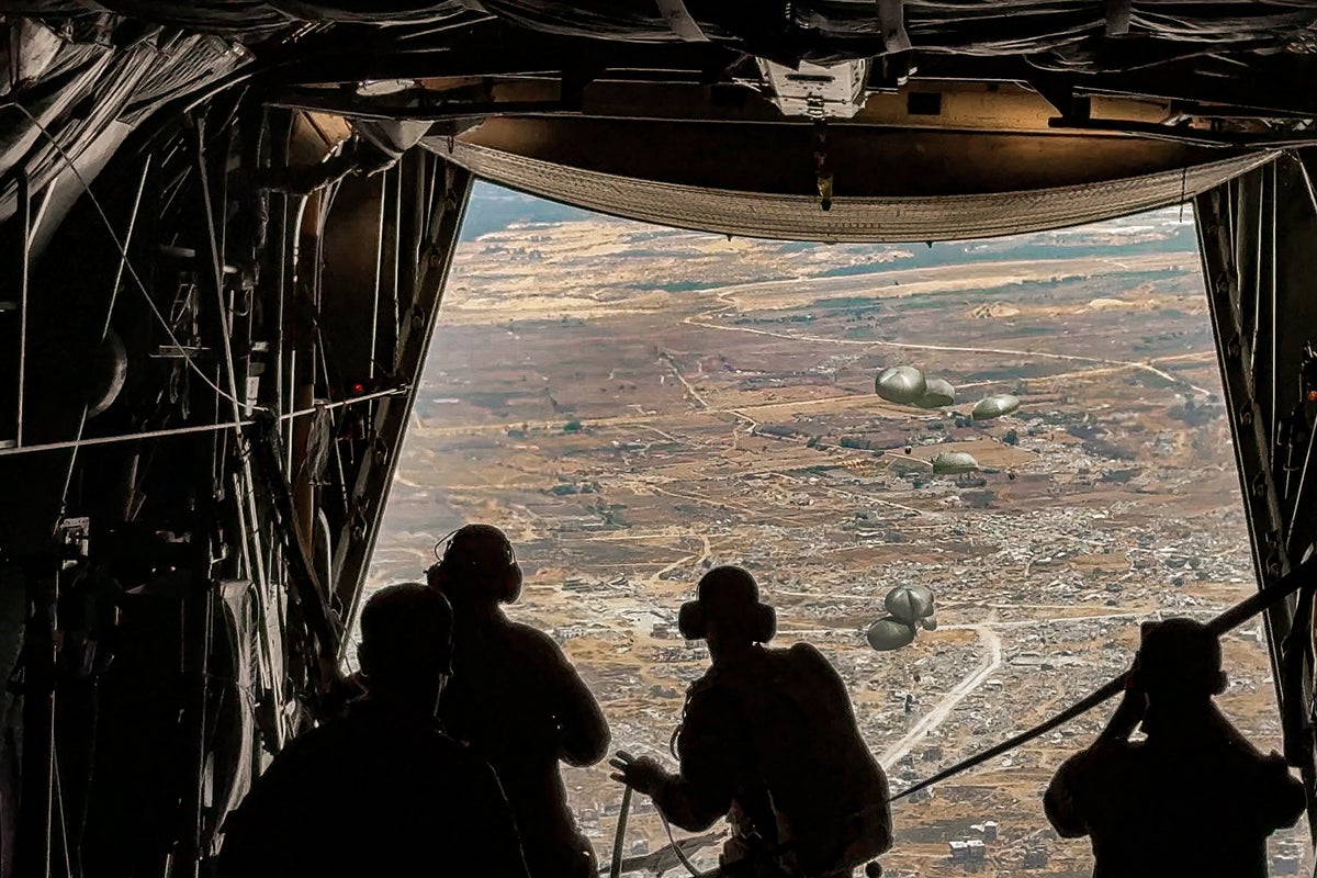 As pallets of aid are flung out of aircraft onto those starving in Gaza, chief international correspondent Bel Trew joins a Jordanian flight – while Nedal Hamdouna watches from the devastated enclave below